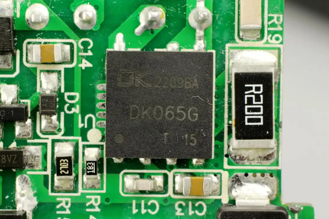 充電器初級(jí)主控芯片采用了一顆來自東科的合封氮化鎵芯片DK065G,是一顆內(nèi)部集成了650V氮化鎵開關(guān)管的準(zhǔn)諧振反激開關(guān)電源功率芯片。DK065G采用谷底開通以降低開關(guān)損耗,最高支持250kHz開關(guān)頻率,待機(jī)功耗低于50mW,采用DFN8*8封裝,適用于PD快充,電源適配器等應(yīng)用。