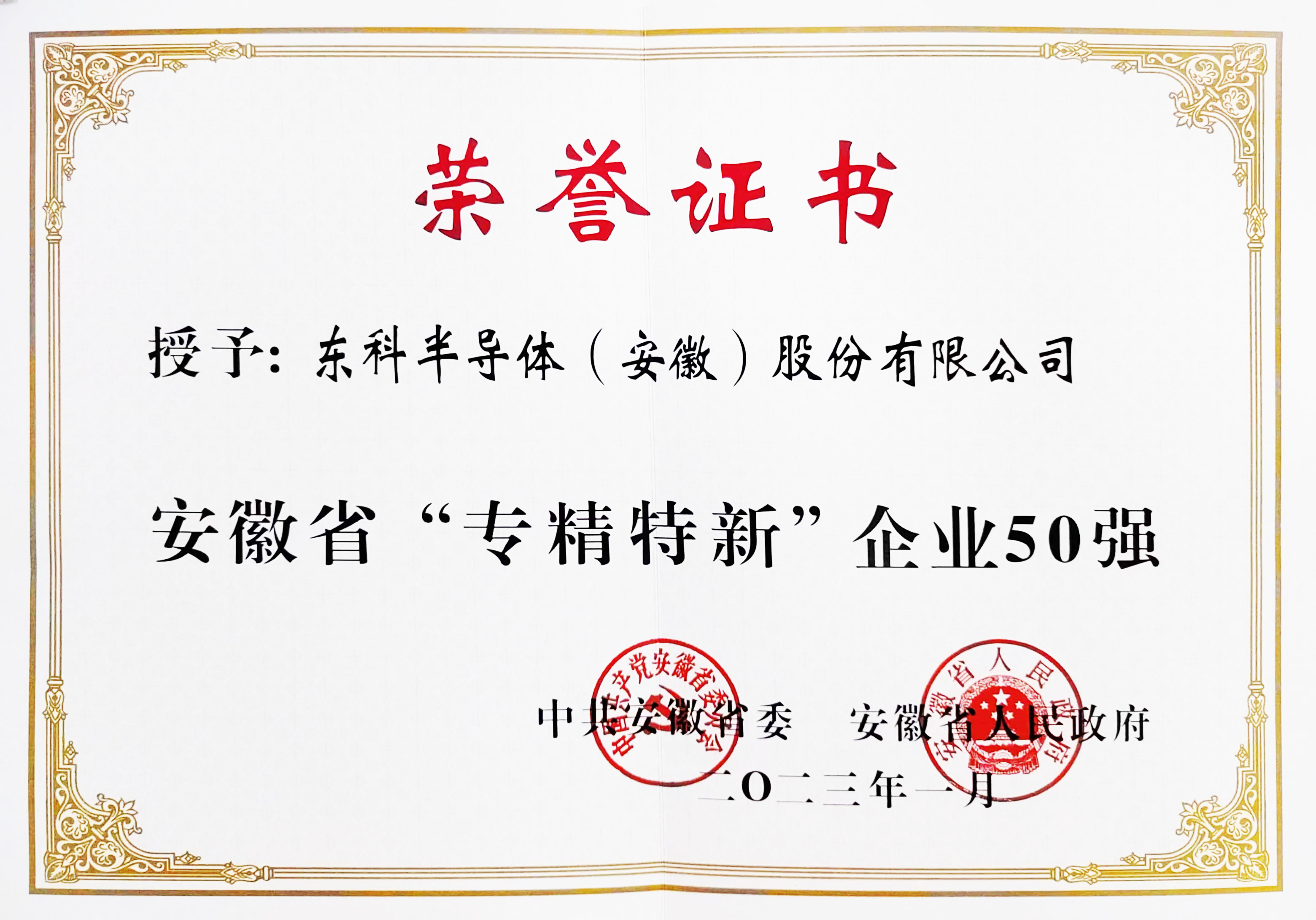 東科半導(dǎo)體榮獲:安徽省“專精特新”企業(yè)50強(qiáng)