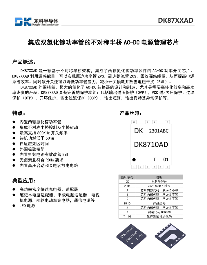 東科半導(dǎo)體推出基于不對(duì)稱半橋架構(gòu)的全合封氮化鎵AC-DC電源管理芯片DK8715AD系列