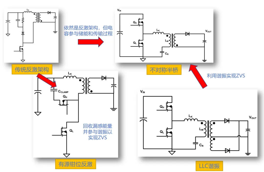 不對(duì)稱半橋AHB拓?fù)浼夹g(shù)集成了LLC和反激的優(yōu)點(diǎn),實(shí)現(xiàn)了初級(jí)側(cè)零電壓開關(guān)(ZVS)和次級(jí)側(cè)零電流開關(guān)(ZCS),提高了系統(tǒng)的效率。通過采用電感與電容雙儲(chǔ)能元件,可以有效減小變壓器體積,從而提高系統(tǒng)的整體緊湊性。